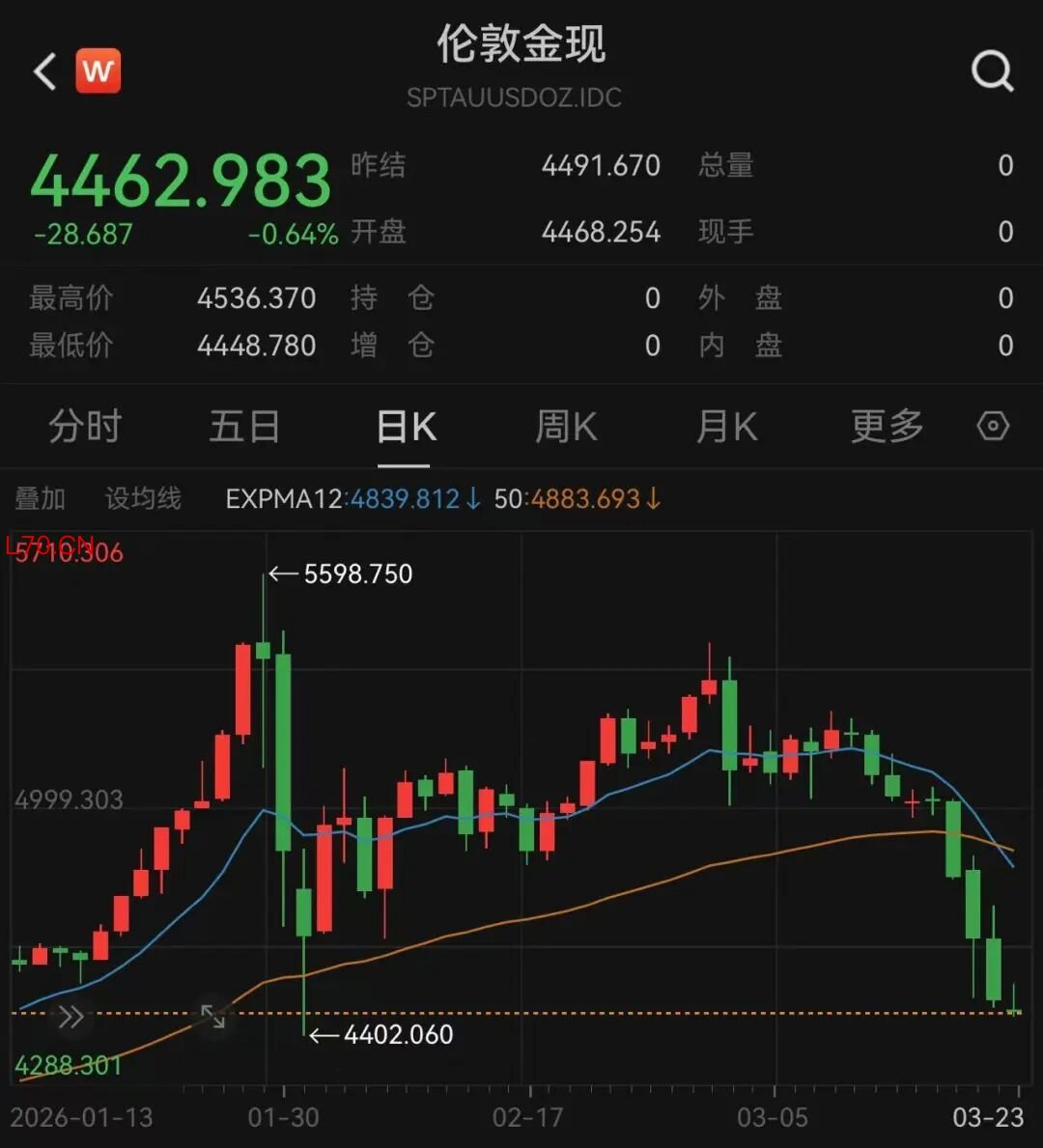 北京时间3月23日,国际金价短暂冲高后快速回落,再创阶段性新低。截至发稿,伦敦现货黄金盘中一度收复4530美元/盎司关口,随后一路走低,最低下探至4448.78美元/盎司,创2月2日以来新低。