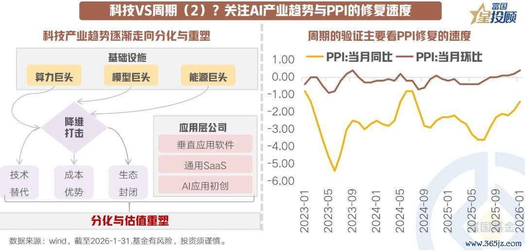 从长周期来看,科技的核心投资逻辑在于AI产业趋势的发展。当前资本市场认为除了掌握算力、模型、能源的基础设施巨头,其他应用层公司,都可能被降维收编或淘汰,进而造成软件类估值下杀。而实际上,AI的进步势必是渐进的,逐步出现的“局部颠覆”积累才会出现“全面颠覆”。而在这个过程中,生产力、生产关系、政治体制、产业组织形式、社会组织形式都会随之发生变革。未来的核心在于,谁能在物理世界的联系更强,壁垒就更深,当前悲观的情绪仍在释放的过程中。而周期的验证则主要看PPI的修复速度,当前海外定价品种已向国内定价品种在传导,但最终内需的见底修复是PPI回升的核心。