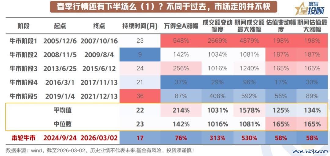 行情是否还有下半场取决于价格是否比价值跑的快。从历次的牛市去对比,本轮万得全A上涨的幅度以及时间,都不及前五轮极致,当前估值、涨幅、成交额的抬升均处于均值偏低水平,市场走的并不快。一、估值修复尚在途中。本轮主要指数累计涨幅并未显著偏离季节性均值。过去快牛阶段往往伴随短期内估值快速脱离合理区间,而当前无论是市盈率还是股债性价比,均未触及过热阈值。涨幅不高,意味着空间并未被提前透支。二、量能释放刚刚开始。市场活跃度的真实指标是成交额与两融数据的配合。目前两市成交温和放大,日均成交维持在2-3万亿左右,但并未出现极端放量的情绪顶信号。杠杆资金回流节奏平稳,增量资金的入场仍处初期阶段,尚未形成一致性拥挤。三、时间换空间的结构特征。本轮行情的显著差异在于节奏:指数通过反复震荡而非快速拉升消化抛压,这种“磨上去”而非“冲上去”的走法,反而让筹码交换更充分。