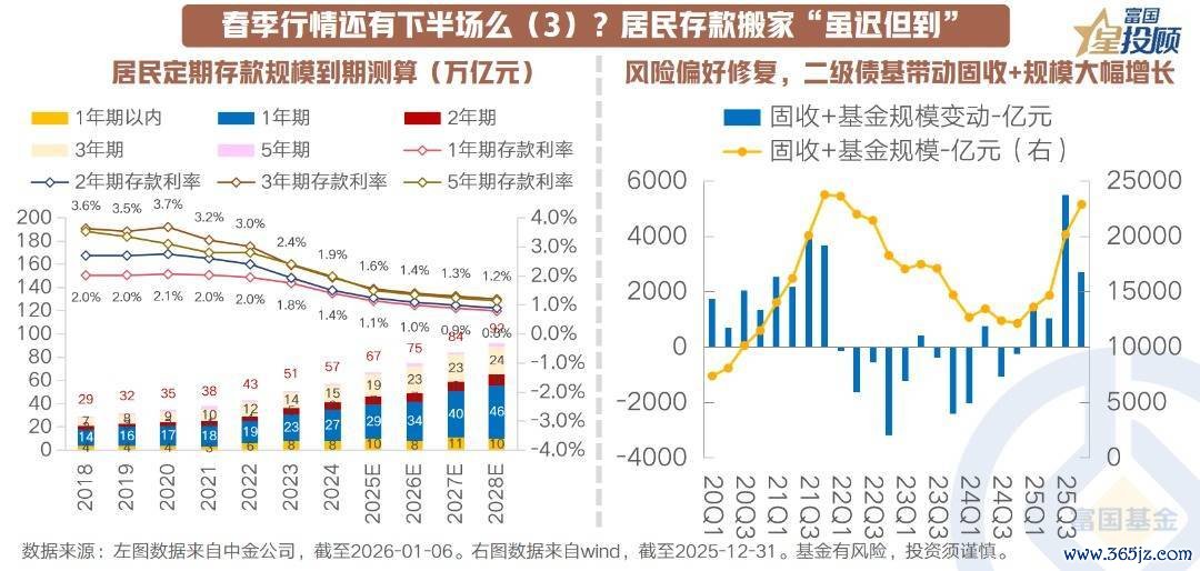 春季行情能否延续,最终还是要看增量资金。而当前最确定的增量来源,正是居民存款搬家——这一进程或许比市场预期的更慢,但不会缺席。“虽迟”是因为居民风险偏好的修复需要时间,“但到”是因为低利率环境与股市财富效应的累积不可逆转。存款搬家刚刚拉开帷幕,下半场的流动性基础依然稳固。中金公司预测,2026年将有60-70万亿的定期存款到期,虽然这些存款的90%以上还会继续留存在银行存款内,但仍有部分资金由于“低利率”而转向寻求更高、更稳健的收益。这一现象已经悄然发生,固收+基金作为这一载体,2025年Q4单季度规模增长约2700亿元。