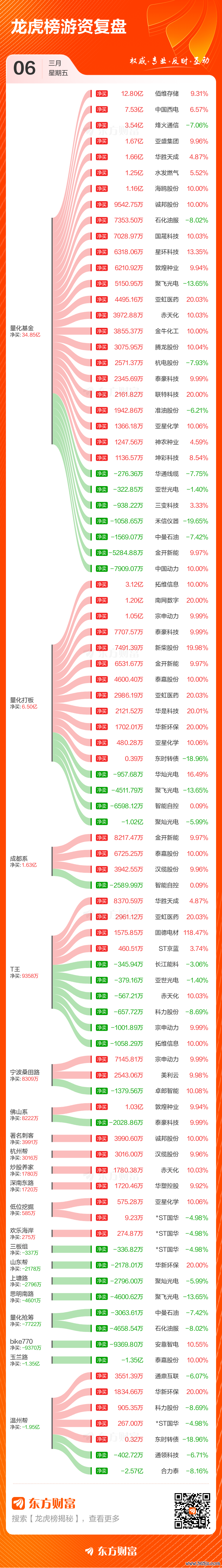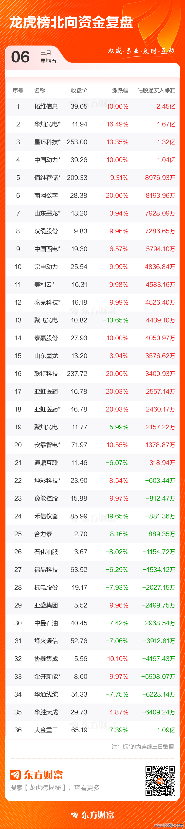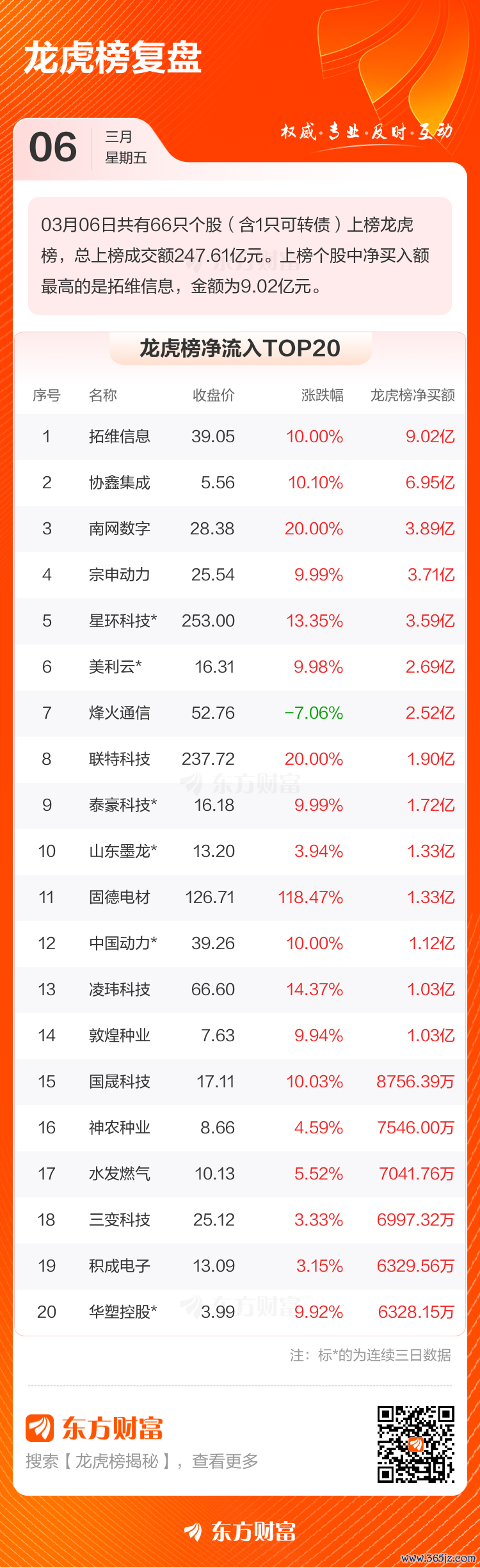 3月6日共有66只个股(含1只可转债)上榜龙虎榜,总上榜成交额247.61亿元。上榜个股中净买入额最高的是拓维信息,金额为9.02亿元。