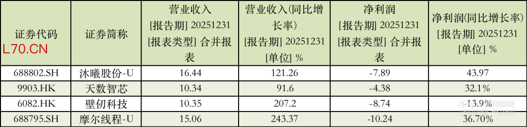 增速方面,摩尔线程、壁仞科技2025年营收增长均超过2倍,分别增长243.37%、207.2%。沐曦股份、天数智芯的2025年营收也分别增长121.26%、91.6%。